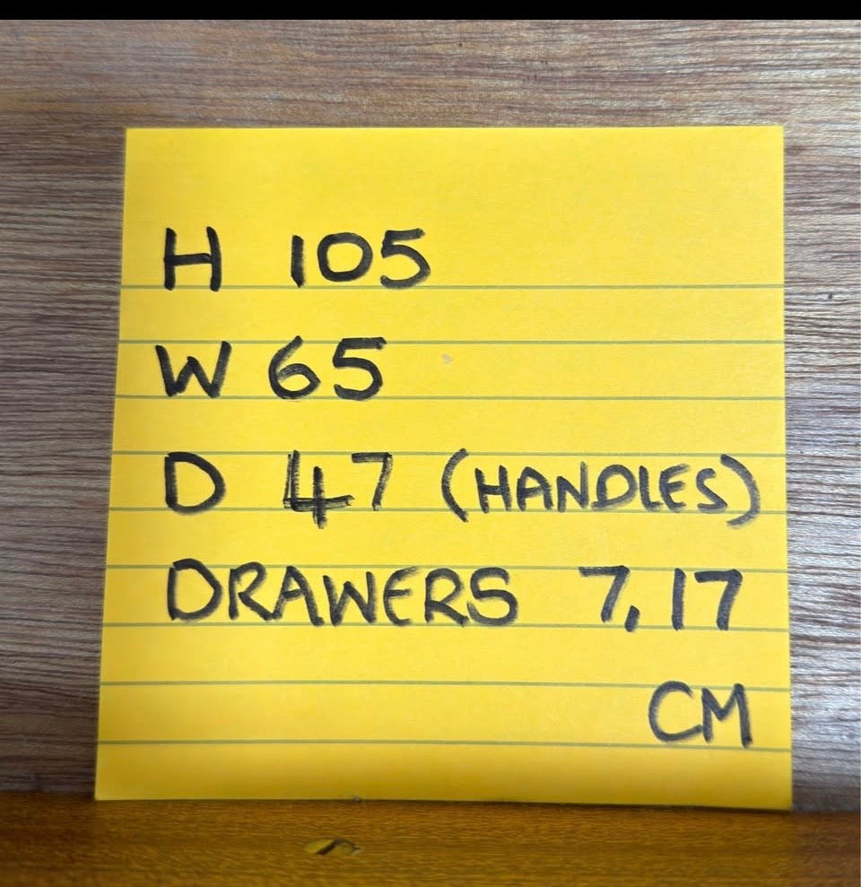The grain is very nice and there’s 3 large drawers & 2 small ones, which all run smoothly. It’s very clean with just a few small imperfections commensurate with age.